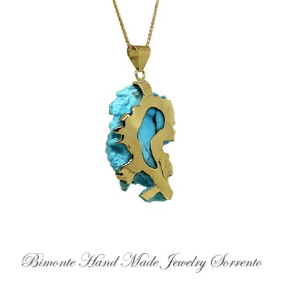 Genuine hand carved sleeping beauty torquoise stone pendant set in solid gold 18ct and solid gold 18ct chain