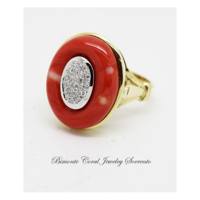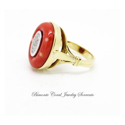 Genuine red coral stone ring set in solid gold 18 ct and diamonds