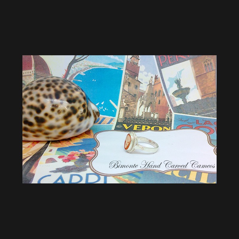 Genuine hand carved shell cameo ring set in sterling silver