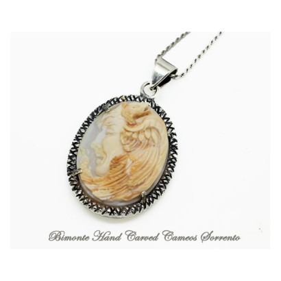 Genuine hand carved shell cameo pendant set in sterling silver and sterling silver chain