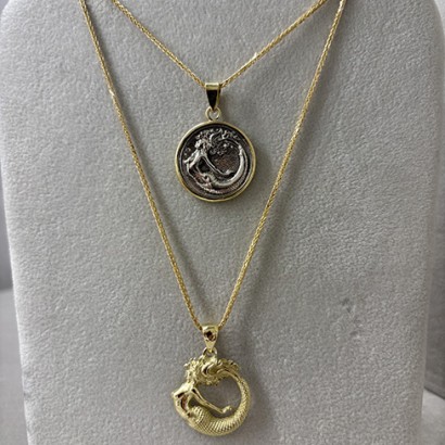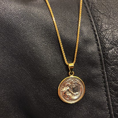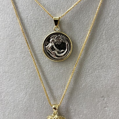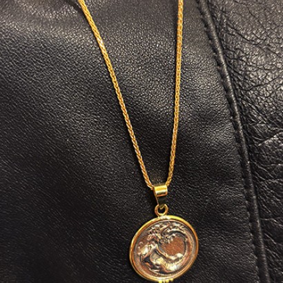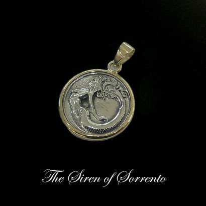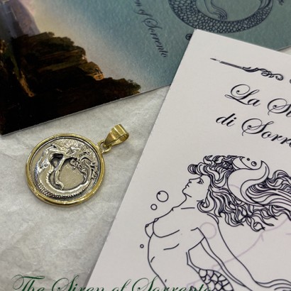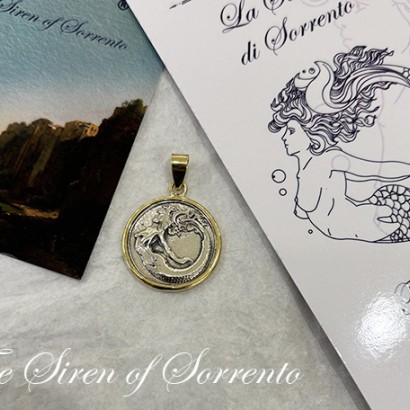 The Siren of Sorrento Coin is in sterling silver 925 while the setting around it and the pendant hook also in solid gold 18 ct.