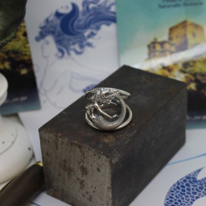 Anello disegnato e creato dalla famiglia Bimonte Sorrento. L'anello è in argento 925 con una leggera brunitura che esalta i dettagli della sirena. L'anello è regolabile per diverse misure.